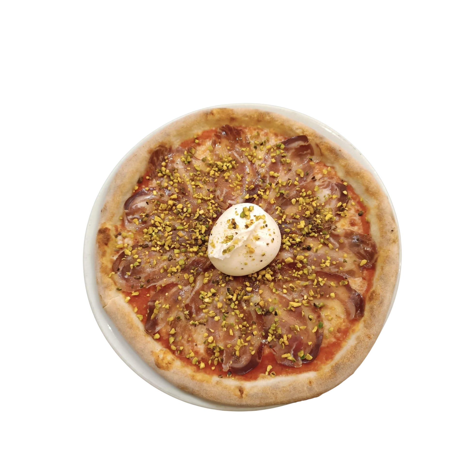 Composizione: Pomodoro, mozzarella, capocollo, burrata centrale, granella di pistacchio