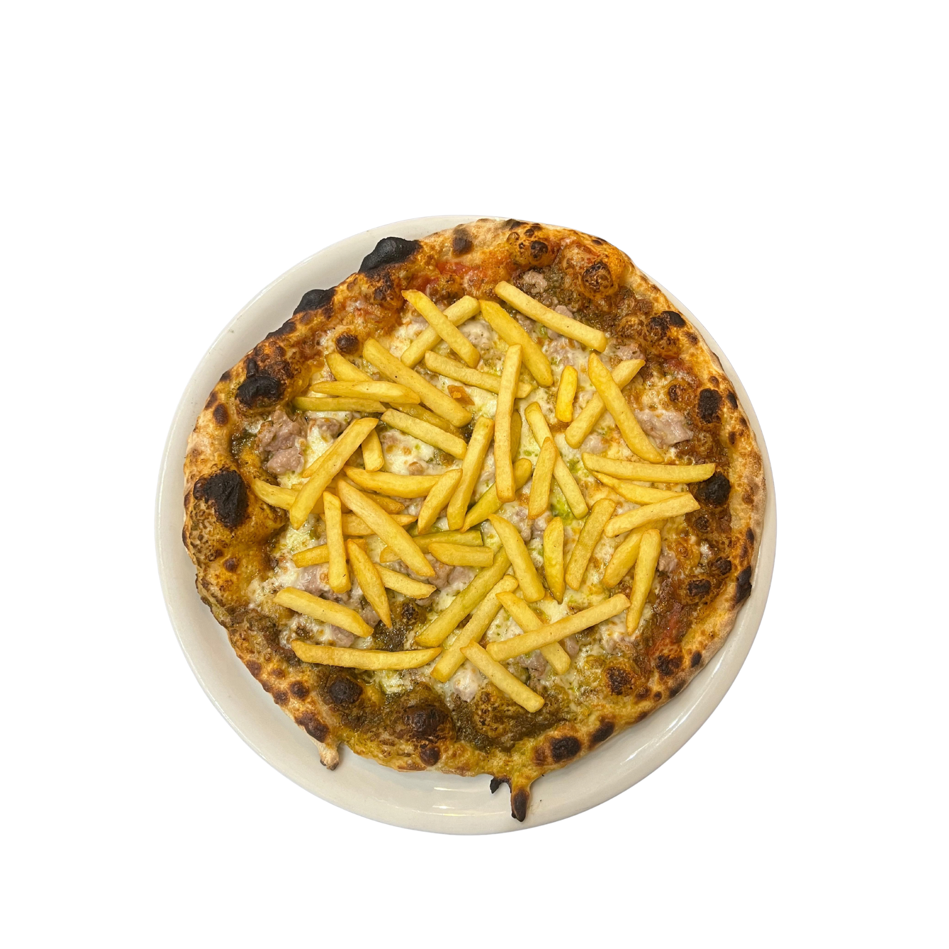 Composizione: Pomodoro, mozzarella, pesto genovese, salsiccia fresca, patatine